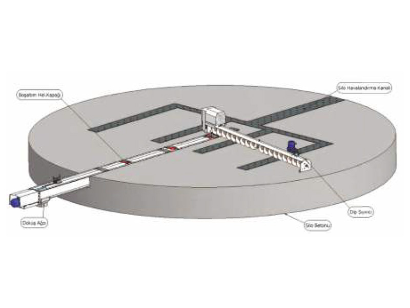 Bottom cleaner conveyor discharges the grains remaining at the bottom of the silo by rotating 360 degrees around itself. The suspension bed system and the steel cage system are made by estimating the grain load falling on them. The drive and motion units are designed individually. This permits the maximum use of bottom cleaning conveyors.